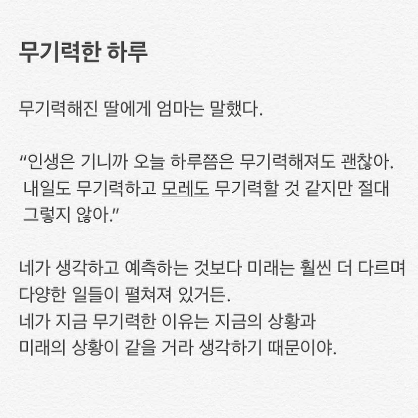 내가 무기력한 이유는 지금의 상황과 미래의 상황이 같거나, 혹은 더 못할 거란 생각 때문인 것 같다.