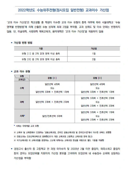 2022학년도에도 서울대에서는 정시에 ‘교과이수가산점’이란 걸 줄 예정입니다.