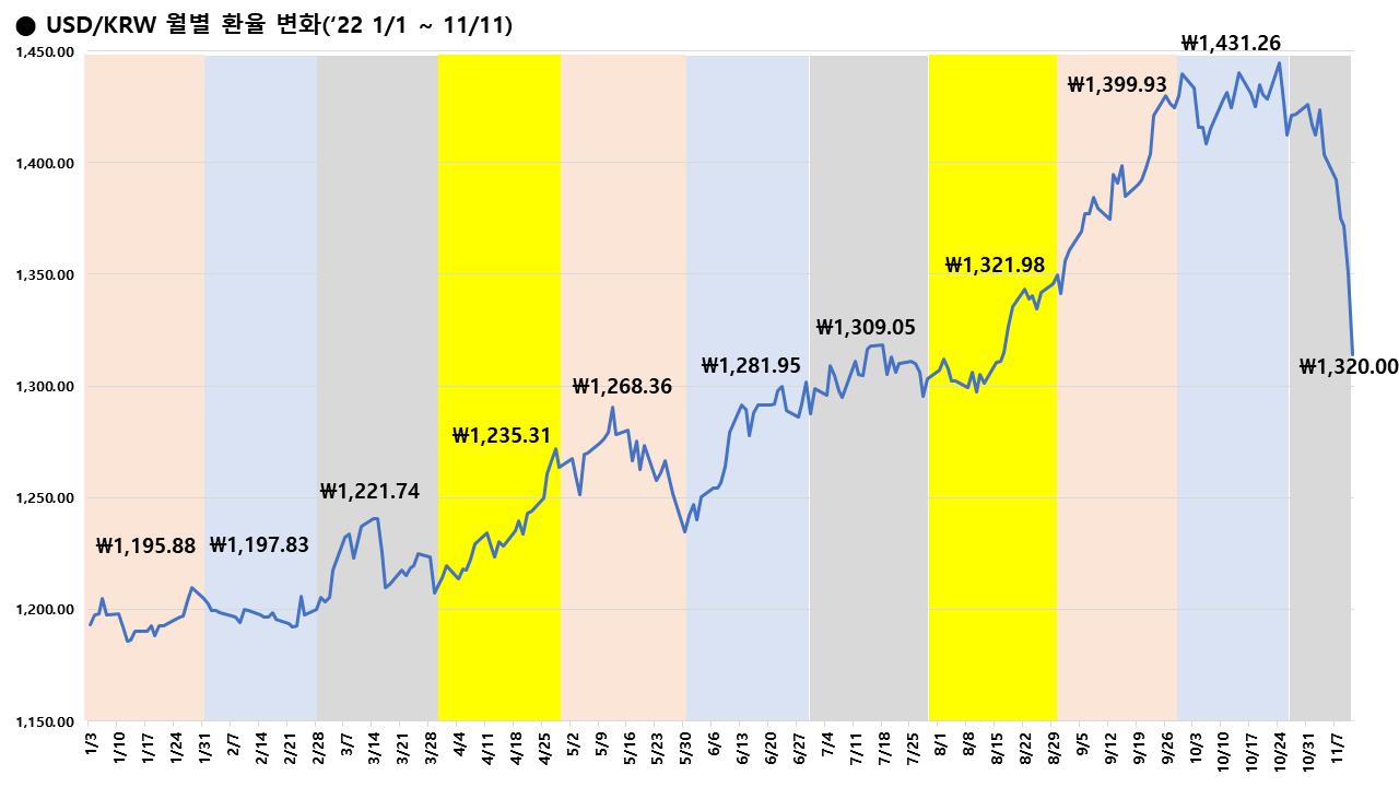 미국 10월 CPI가 발표된 다음날인 11월 11일, 환율은 근래 보기 드문 하락세를 보였다. 11월 10일 종가 1,377.00원이었던 USD/KRW 매매기준율은 11월 11일 종가 1,320.00원으로 수직 낙하했다. 장 마감 후에는 1,320원마저 붕괴되는 모습을 보였다. 2022년 3분기 급격한 환율 상승으로 인해 국가적 위기가 오는 것이 아닌가 하는 우려가 있었으나 11월 환율 하락으로 급박했던 장세는 잠시나마 소강상태에 접어든 듯하다.