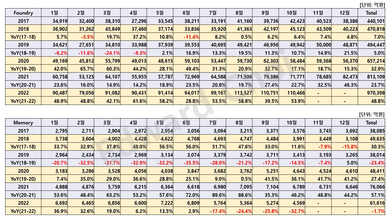 대만의 대표 Fabless인 Mediatek 또한 10월 들어 매출액이 대폭 감소했다. 2022년 상반기만 해도 끝없이 상승할 것만 같았던 Mediatek의 기세도 글로벌 스마트폰 시장이 침체에 결국 꺾일 수밖에 없었다. Mediatek이 주요 고객사인 삼성전자와 중국의 스마트폰 메이커들이 생산량을 줄이거나 신제품의 출시를 미루면서 실적에 직격탄을 맞았다. 재무제표 확인이 가능한 중국의 Xiaomi의 재고가 천정부지인 것을 감안하면 다른 중국 스마트폰 업체들 역시 섣불리 신규 제품을 출시하기보다는 재고 소진에 집중하고 있는 것으로 보인다. 이는 우리나라 메모리 반도체 기업들의 실적과도 연관이 있는데 이에 대해서는 다른 글에서 다뤄보고자 한다.