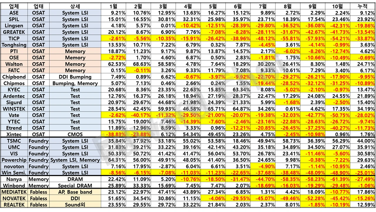 시스템 반도체 패키징 업체 중, SPIL만이 작년도 매출액(YoY)과 비교했을 때, 준수한 매출을 이어가고 있다. 지난달 실적 리뷰에서 언급했지만 AMD 반도체의 패키징 물량 일부가 TF-AMD(TFME 자회사) Suzhou에서 SPIL Taiwan로 이관되면서 반사이익을 누리고 있다. 메모리 반도체 OSAT인 Walton과 FATC 또한 11월부터는 연간 매출액이 마이너스로 돌아설 것으로 예상된다. Winbond, Nanya는 DRAM 가격 하락으로 이미 매출액이 감소세를 보이고 있었다. 하지만 연간 투입량이 정해져 있기 때문에 이들은 Wafer의 출하량을 단시간 내에 줄일 수 없었다. 그래서 Winbond와 Nanya의 패키징 업체인 Walton과 FATC는 패키징 시장이 얼어붙었음에도 Wafer 출하량이 유지되면서 매출 증가세를 이어올 수 있었다. 하지만 11월부터는 Winbond와 Nanya의 Wafer 출하량이 줄면서 Walton과 FATC의 매출 증가세가 반전될 것으로 생각된다.