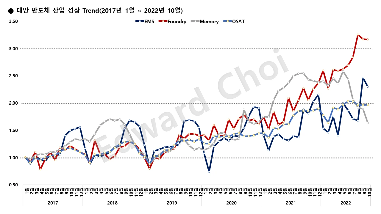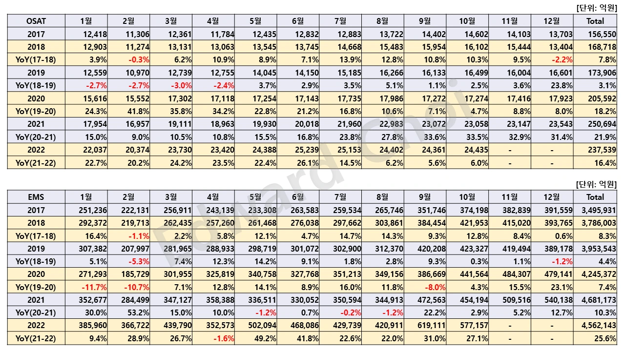 다사다난했던 2022년도 어느새 한 달여 밖에 남지 않았다. 연초부터 시작된 반도체 OSAT 업체들의 부진은 현재 진행형이다. Foundry 업체들의 Wafer 위탁 생산량이 줄면서 매출액은 더욱 큰 폭으로 하락할 가능성이 높다. ASE, SPIL과 같은 거대 업체들로 인해 전체 시장 상황이 왜곡되어 시장 규모는 아직 유지하고 있는 것으로 보일 수 있다. 하지만 TSMC와 Mediatek이 해당 업계 전체를 대표하지 않듯 거대 OSAT업체의 현황만 놓고 시장 전체를 판단하면 안 된다. 중국 코로나 상황이 악화일로에 있기 때문에 이로 인한 전자 제품 조립 산업(EMS)이 타격을 받으면서 반도체 업계의 시름은 더 깊어질 것으로 예상된다.