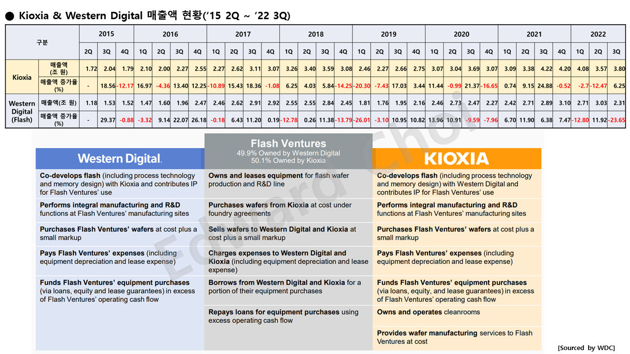 일본의 Kioxia와 미국의 Western Digital(이하 "WDC")은 Nand Flash 사업만을 영위하는 메모리 반도체 업체들이다. Kioxia는 Toshiba 분식회계 사태 후, 2018년 분사한 Toshiba 반도체 사업부를 모태로 하고 있으며, 컴퓨터 하드디스크 생산업체인 WDC의 Flash 사업부는 2016년 인수한 미국의 Nand Flash 생산 업체인 SanDisk가 그 시작이다. Kioxia와 WDC는 양사가 공동 투자한 Flash Ventures(Kioxia 50.1%, WDC 49.9%)를 통해 일본 욧카이치시에 위치한 Wafer 공장을 함께 운영한다. JV가 소유한 욧카이치 공장에서 생산된 Wafer는 계약된 수량과 가격에 따라 양사에 분배된다. Kioxia는 WDC와 공동으로 운영하는 Fab. 외 자체 Wafer 조달을 위한 Fab. 을 추가적으로 가지고 있기 때문에 WDC 보다 가용 Wafer가 많다. Kioxia는 자체적으로 확보한 물량을 미국의 Kingston과 같은 Nand Flash를 기반으로 한 저장매체 제조업체들에게 판매한다. 저장매체 기업들은 Kioxia로부터 구매한 Wafer를 대만의 PTI와 OSE 같은 OSAT 통해 패키징 한다.