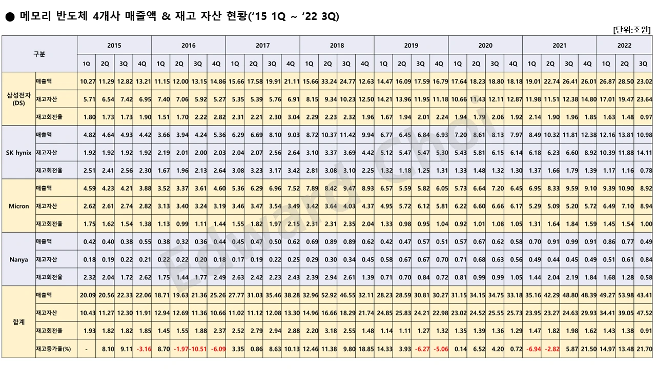 우선 재무제표를 통해 반도체 사업의 매출 & 재고 확인이 가능한 4개사의 정보를 취합하여 시장 상황을 살펴보자. 삼성전자(한국), SK hynix(한국), Micron(미국), Nanya(대만) 중 Nanya를 제외한 3개 사는 DRAM과 Nand Flash 2개 분야에서 사업을 영위하고 있다.
