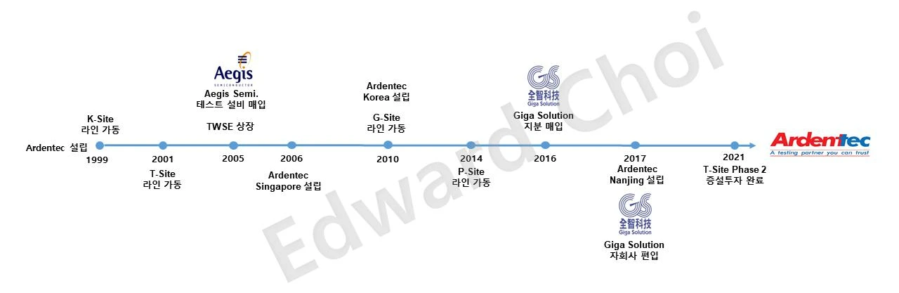 Ardentec은 IC 테스트(Final Test) 분야의 경쟁력 강화를 위해 2016년 대만 Giga Solution의 지분을 매입하기 시작했다. 2017년 Ardentec은 이사회의 동의를 얻어 Giga Solution을 완전 자회사로 편입시켰다. 이를 통해 Ardentec은 IC 테스트에 대한 포트폴리오와 확충과 함께 규모의 경제를 달성하는 발판으로 삼았다. Ardentec은 2017년 중국 난징(南京)에 Testing용 공장을 준공하고 중국 반도체 메카로 떠오른 허베이성과 저장성의 Wafer 테스트 선점에 나섰다. 중국 남경에는 TSMC의 12인치 파운드리 Fab. 이 위치하고 있어 난징 공장 투자는 TSMC와의 협업 또한 고려된 포석이었다.