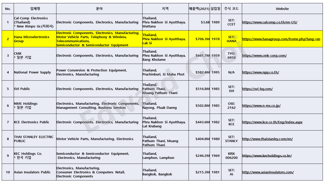 외국계 반도체 기업들의 패키징 공장이 주를 이루는 태국 반도체 산업계에서 태국계 기업으로서 반도체 패키징 사업을 영위하는 업체로는 Hana Microelectronics(이하 " Hana Micro")와 Stars Micro 2곳이 있다. 이번 글에서는 Hana Micro에 대해 다뤄보고자 한다. Hana Micro는 1978년 전자 제품의 단순 조립을 목적으로 설립된 회사다. 1993년 2월 태국 증시에 상장된 Hana Micro는 현재 태국 100대 기업에 속하는 거대 기업으로 성장했다. 태국의 자국 전자기업 중 2위에 랭크되어 있으며 반도체, 마이크로일렉트로닉스, 마이크로 디스플레이를 포함한 다양한 전자 산업에 대한 광범위한 조립 서비스를 제공하고 있다. Hana Micro는 중국계 화교 자본인 OMAC이라는 회사의 지배를 받고 있다.