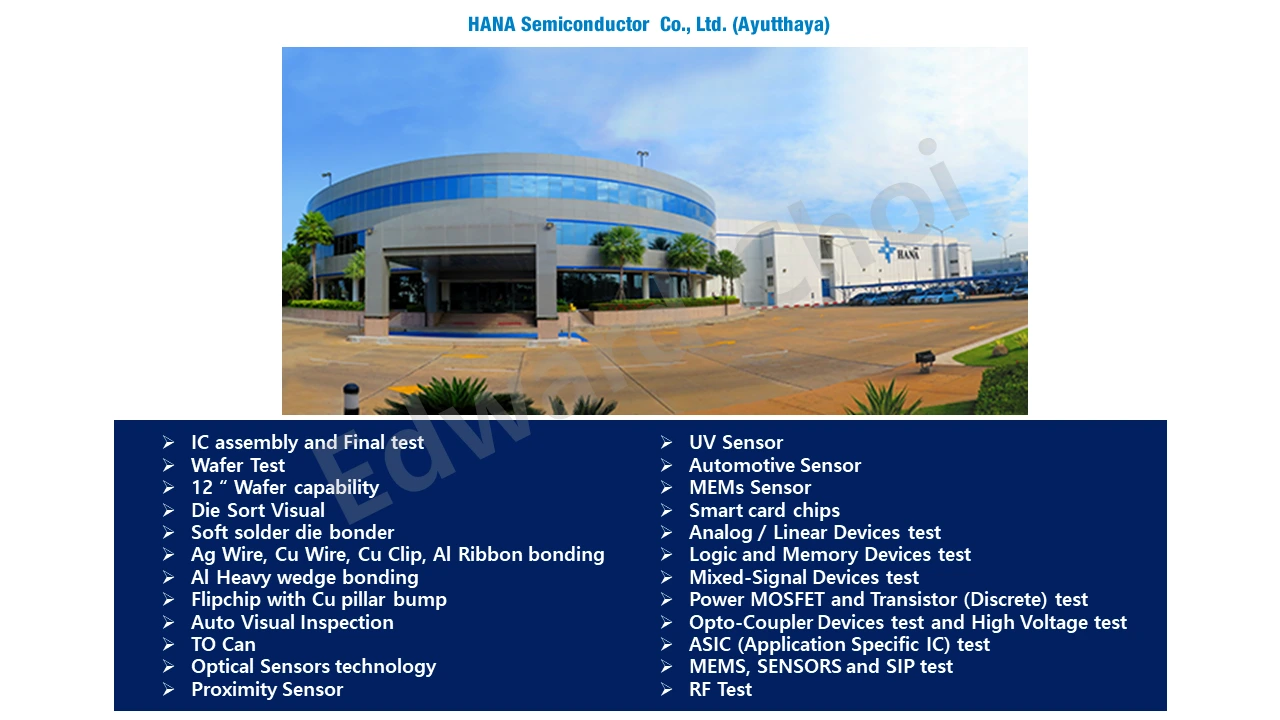 Hana Micro가 보유한 여러 생산 Site 중 반도체 생산을 담당하는 곳은 태국의 아유타야(Ayutthaya)와 중국의 가흥(Jiaxing) 2곳이다. 2곳 모두 Lead Frame base의 Mid-low end 반도체를 생산하고 있다. 2021년 Hana Micro가 생산한 68억 개의 반도체 중, 51억 개를 아유타야 공장에서, 17억 개를 가흥 공장에서 생산했다.
