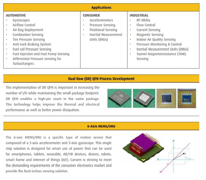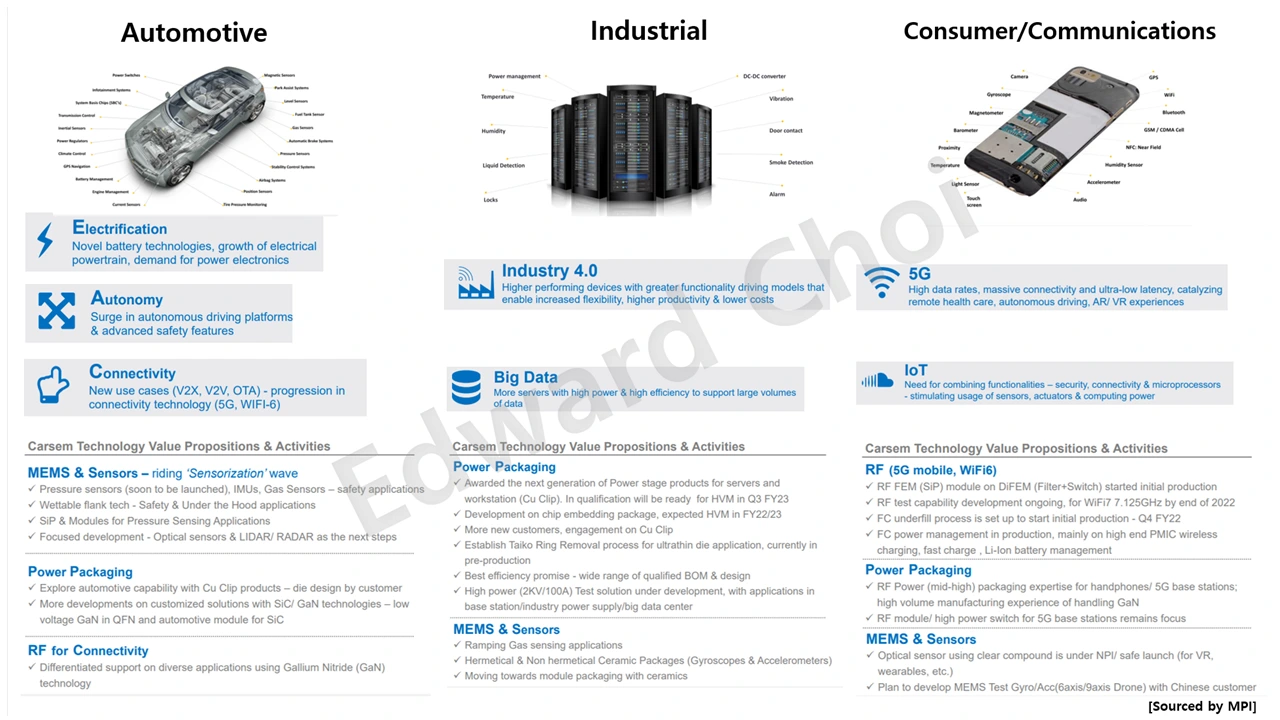 Carsem은 사업 영역을 크게 Automotive, Industrial, Consumer/Communication으로 나누고 Lead Frame 기반의 패키징 기술을 활용하여 해당 영역을 공략하기 위한 맞춤형 전략을 실행 중이다. (MEMS & Sensor, Power Packaging, RF IC)