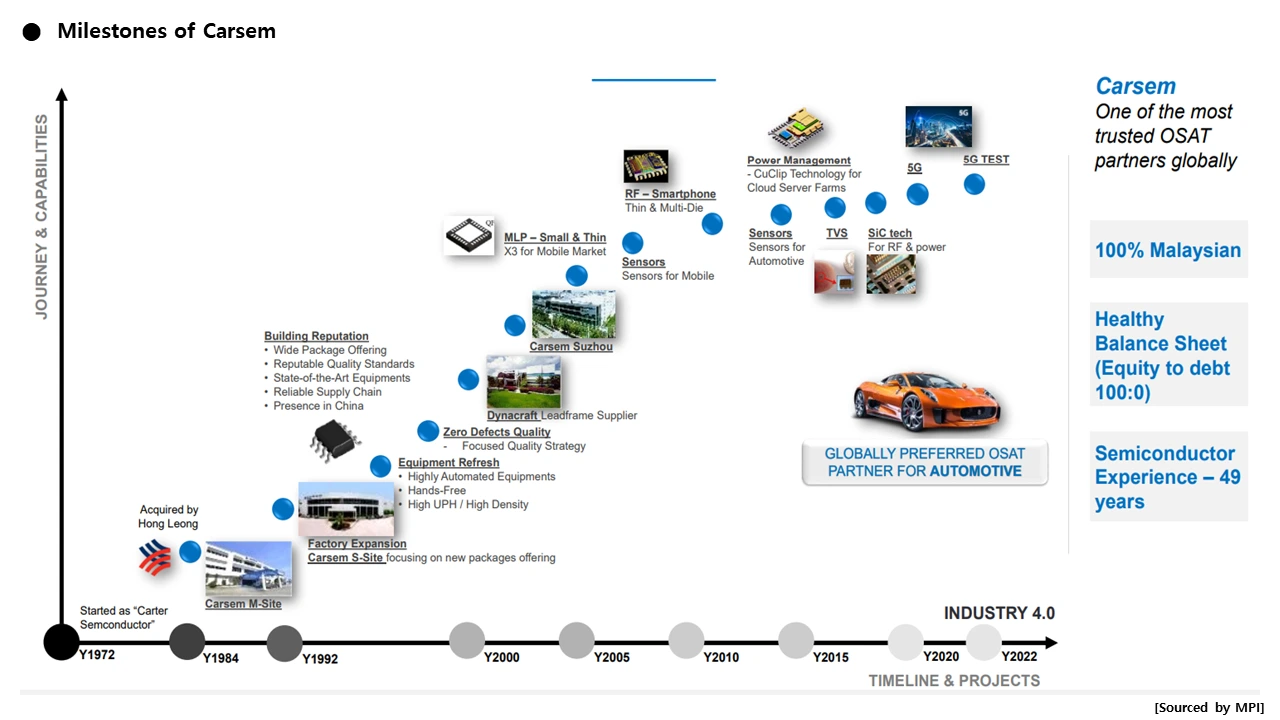 MPI의 자회사인 Carsem(OSAT)과 DCI(Lead Frame)는 1972년, 1974년에 각각 설립되었다. Carsem과 DCI는 1984년과 2000년에 MPI에 차례대로 인수되어 HongLeong 그룹의 관계사로 편입되었다. 현재 Carsem은 말레이시아에 M-Site와 S-Site 2곳의 생산공장과 중국 Suzhou에 해외 생산 공장을 운영하고 있다. DCI는 말레이시아 공장만을 운영 중이다. Carsem과 DCI는 MPI 산하에 있는 한집안 식구이지만 DCI에서는 형제 회사인 Carsem의 고객사 눈높이를 충족할만한 수준의 Lead Frame을 생산하지 못하기 때문에 Carsem에서조차 DCI의 제품 사용을 꺼리는 실정이다. DCI는 말레이시아에 위치한 패키징 업체들에게 저사양의 Lead Frame을 주로 공급하고 있다.