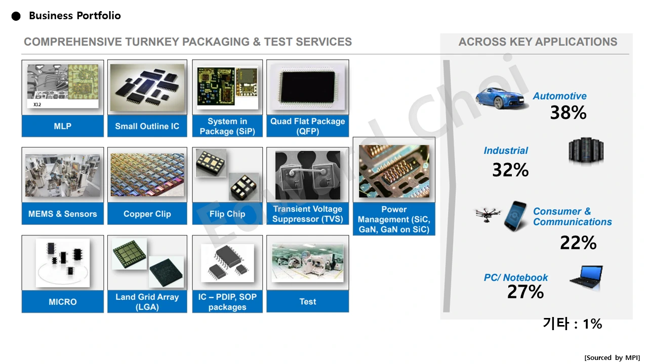 이제 MPI 산하에서 OSAT 사업을 영위하고 있는 Carsem에 대해 알아보자. Carsem은 자동차용 반도체 업체인 NXP, Infineon과 통신칩 업체인 Broadcom, 아날로그 반도체 업체인 TI 등을 주요 고객사로 두고 있다. 위에 있는 Carsem의 비즈니스 포트폴리오를 보면 Carsem에서 생산하고 있는 제품은 대부분 Lead Frame 기반의 반도체이다. 물론 Substrate 기반의 반도체를 일부 생산하지만 그 비중은 높지 않다. Carsem에서 패키징 하는 반도체의 최종 Application은 자동차용 38%, 산업용 32%, 소비재 & 통신용 22%, PC & 노트북 27%로써 특정 산업군에 편중되지 않은 균형 잡힌 모습을 보여주고 있다.