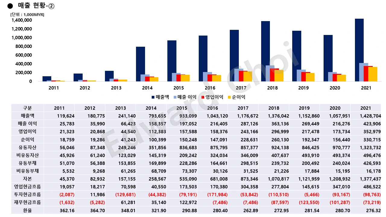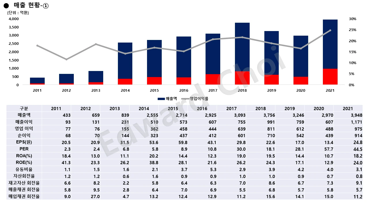 Inari는 매년 6월을 기점으로 연간 매출을 마감한다. 이 글에는 2021년까지의 정보를 담았으나 2022년 결산도 이미 마감되었다. 타 OSAT와 정보를 비교함에 있어 혼돈이 생길까 봐 2022년 회계정보는 싣지 않았다. 2021년 마감 자료를 보면 Inari는 3,948억 원의 매출에 975억 원의 영업이익을 올려 25%에 달하는 높은 영업이익률을 달성했다. 일반적으로 알고 있는 저마진 구조의 OSAT산업에서 25%의 영업이익률은 Top Tier OSAT업체들과 비교해도 전혀 뒤지지 않는 수준이다. 거대 Fabless인 Broadcom으로부터의 안정적인 위탁 물량과 OSRAM을 통한 LED 관련 패키징까지 Inari에게 있어서만큼은 한정적인 고객사가 OSAT사업을 영위하는 데 있어 단점으로 작용하지 않는 듯하다.