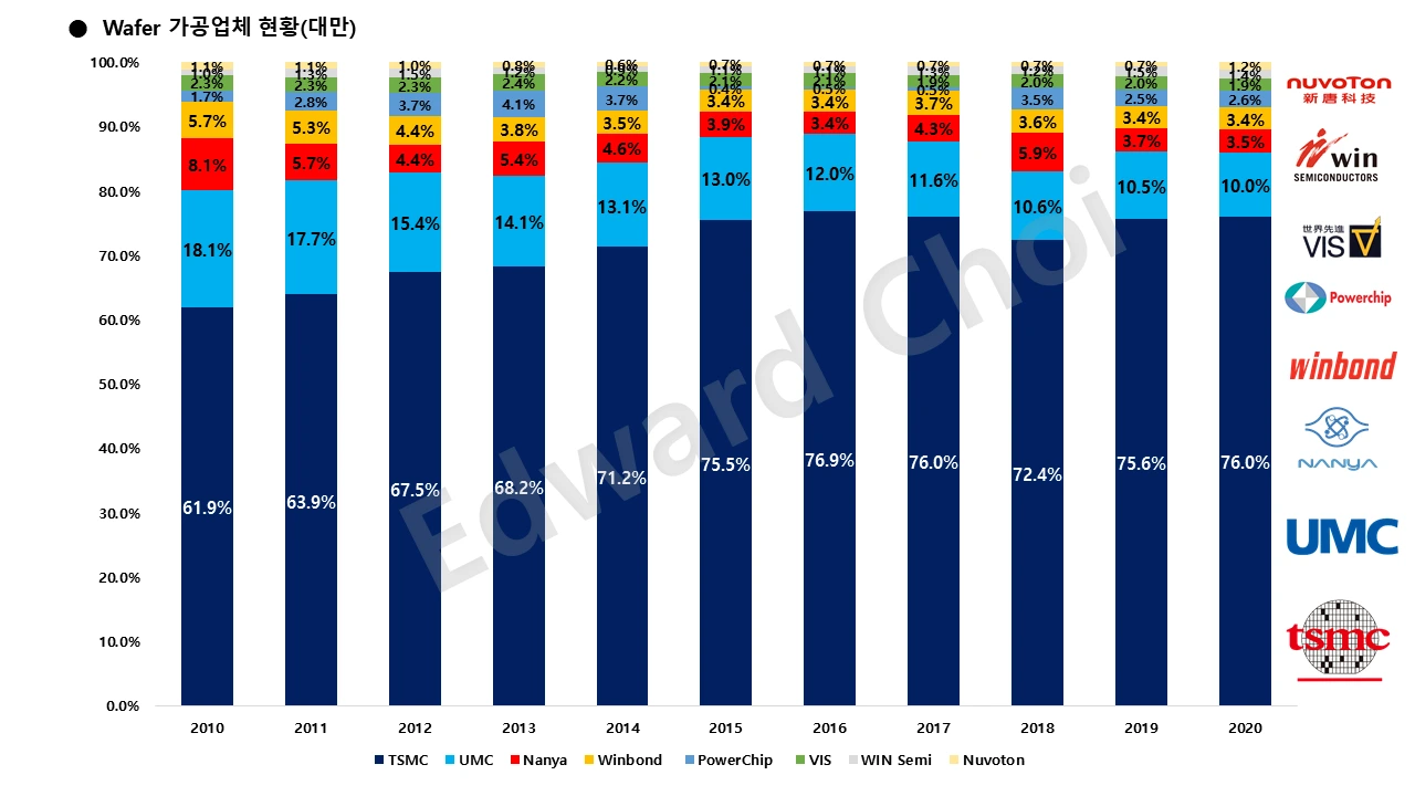 1987년 TSMC의 前회장 모리스 창(張忠謨·장중모)이 대만 신주(新竹) 과학단지에 Wafer 가공만을 전문으로 하는 TSMC를 설립하면서 대만의 반도체 산업은 일대 전환을 맞게 된다. 모리스 창은 "고객의 칩을 생산하되 자사 브랜드의 칩을 설계하거나 생산하지 않는다. 고객들과 절대로 경쟁하지 않는다."라는 설립 모토를 내걸고 Foundry라는 새로운 반도체 생태계를 만들었다. 그동안 IDM(Integrated Device Manufacturer-종합 반도체 회사)의 양산 라인을 빌려 힘겹게 반도체를 생산하던 팹리스(Fabless-설계업체) 업체들에게 있어서 TSMC는 구세주 같은 존재였다. 1990년대 말, 2000년대 초반 모바일 산업의 태동으로 당시만 해도 규모가 크지 않았던 팹리스 업체들 중에서 퀄컴과 같은 거대 팹리스 업체들이 속속 등장하기 시작했다. 이에 따라 팹리스의 Wafer를 가공하던 TSMC의 사세도 커져갔지만 저사양의 휴대폰에 탑재되는 반도체의 수가 한정적이다 보니 성장 속도는 완만했다. 2008년 스마트폰의 등장으로 인해 반도체 성능이 비약적으로 발전하기 전까지 TSMC를 비롯한 Foundry 업체들은 기술력과 생산력 면에서 메모리 반도체 생산업체보다 한 수 아래로 여겨졌다.