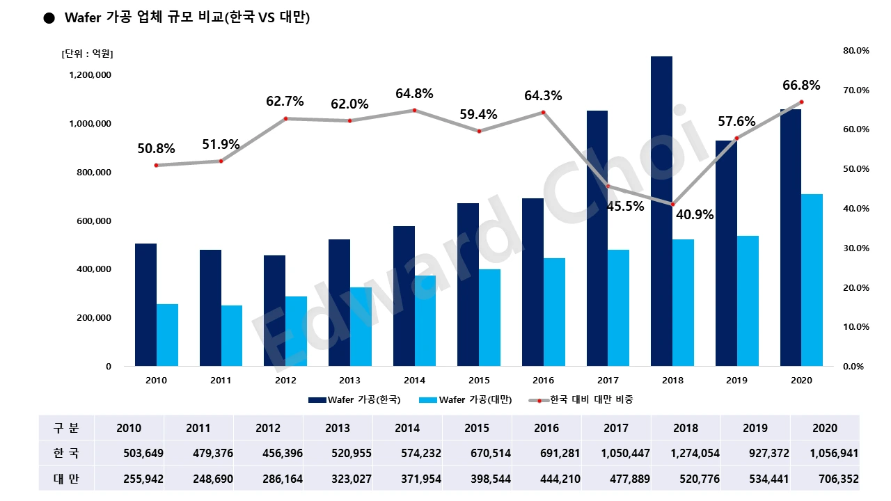 앞에서 부족하나마 대만 반도체 산업의 발전사를 먼저 설명한 것은 대만 Foundry의 성장과 메모리 반도체의 쇄퇴가 대만 OSAT산업에 직접적인 영향을 주었기 때문이다. 우리나라 OSAT업체들이 메모리 반도체와 DDI 위주로 성장할 수밖에 없었던 이유는 메모리 반도체와 DDI가 우리나라 Wafer 가공업체의 주업(主業)이며 이를 OSAT업체들에게 패키징 위탁을 맡겼기 때문이다. 동일한 관점에서 보면 대만에 TSMC와 UMC 와 같은 Foundry 업체들이 존재하기 때문에 대만의 OSAT 산업이 강한 것이다.