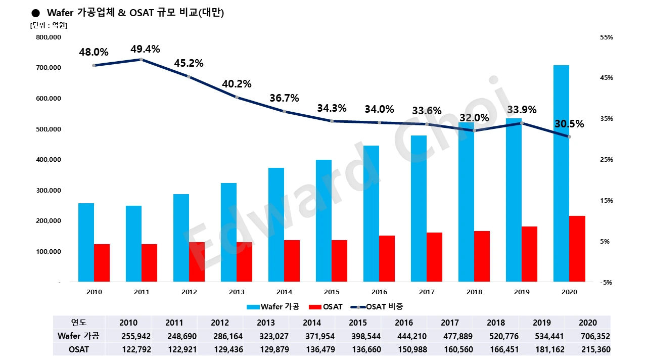 이처럼 대만의 OSAT업계는 대만 Foundry 업체들의 성장에 대한 확실한 낙수효과와 Foundry와 연계된 시너지 효과로 성장을 거듭하고 있다. 2010년 Wafer 가공업체 규모의 48%에 달하던 OSAT업계 규모는 2020년 30.5%까지 떨어졌으나 이는 대만 Foundry 업계의 폭발적인 성장에 기인한 것으로 OSAT 업계가 Foundry와 함께 성장하고 있다는 것에는 변함이 없다.