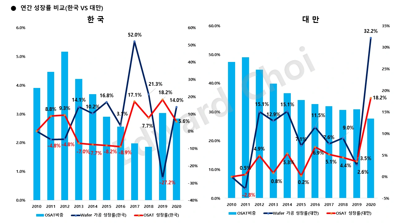 우리나라와 대만의 OSAT산업 규모 비교한 도표를 보면 2012년을 기점으로 양국 간 격차가 벌어지는 것을 알 수 있다. 스마트폰에 탑재되는 반도체의 수량이 늘어나고 반도체의 패키징 방식이 고도화되며, 메모리와 DDI에 편중된 우리나라 업체들은 대만 업체들과의 격차를 좀처럼 줄이지 못하고 있다. 2020년 기준으로 우리나라의 OSAT 규모는 대만의 12.8%에 불과한데 2021년 대만 OSAT업계가 20%가량 성장한 것을 감안하면 2021년의 격차는 더 벌어질 것으로 예상된다.