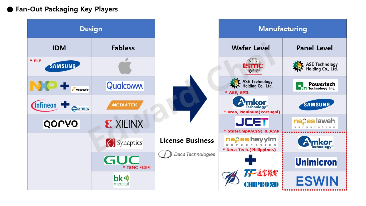 수많은 난제들이 산적해 있음에도 불구하고 기술적 허들을 뛰어넘으며 FO-PLP 개발과 양산을 위한 노력은 이어지고 있다. 현재 삼성전자, ASE, PTI, 네패스가 자사의 물량, 고객사의 위착 물량을 양산을 하고 있다. 하지만 Fan-Out 기술 중에서 비교적 낮은 진입장벽과 물량 Base로 시장을 뒤흔들 수 있다는 점 때문에 FO-PLP시장에 신규로 진입하고자 하는 업체들이 많다. BOE의 LCD 제조 기술을 기반으로 한 ESWIN과 PCB 제조 기술을 기반으로 한 Unimicron까지 참전하게 되면 FO-PLP 시장의 재편을 위한 치열한 경쟁이 시작될 것으로 예상된다. 설상가상으로 OSAT업계의 강자 Amkor 역시 Panel 방식의 Fan-Out 패키징 개발을 완료하고 고객사 승인 단계에 있다.