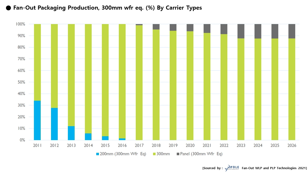 이처럼 FO-PLP은 대면적을 활용하여 생산량을 늘리는 대신 이에 대한 반작용으로 다른 기술적 이슈가 발생하기 때문에 결코 쉬운 기술이 아니다. 또한 Wafer Size의 설비는 이미 표준화된 반면 FO-PLP를 생산을 위한 설비는 업체별로 가진 독특한 패널 Size에 따라 별도로 제작해야 하기 때문에 제조 설비의 가격이 비싸고 납기가 긴 단점이 있다.