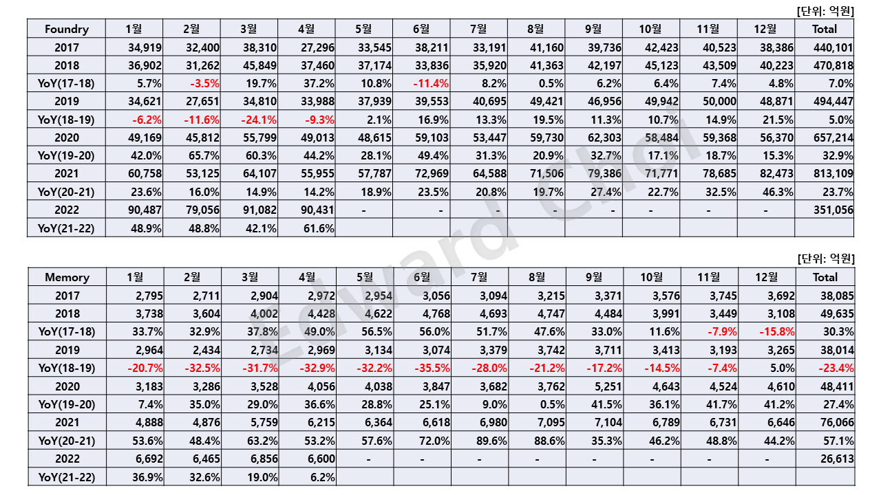 포털에서 "4월 대만 반도체 산업"에 대한 내용을 검색해 보면 대부분 대만 반도체 산업의 매출 호조에만 초점이 맞춰져 있다. 물론 지금 당장의 매출 호조가 뉴스거리가 될 수 있지만 개인적으로는 현재 시장을 객관적으로 바라볼 수 있는 시각 역시 필요하다고 생각한다. 그래야만 향후 시장 변화를 예측할 수 있는 힌트를 얻을 수 있기 때문이다.