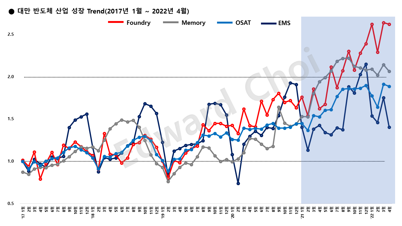 OSAT업체들을 위주로 시장 상황을 주시하고 있지만 이들의 미래 변화를 예상하기 위해서는 전후방 산업을 함께 살펴볼 필요가 있다. 우리나라 반도체 산업은 메모리 반도체의 비중이 높고 파운드리 역시 삼성전자의 선단 공정에 대한 의존도가 높다. 그렇기 때문에 우리나라 업체들을 통해서 전체 반도체 시장을 가늠하기에는 부족한 부분이 있다. 그래서 대만의 OSAT업체뿐만 아니라 대만의 Foundry와 Memory 그리고 EMS까지 넓은 범위를 모니터링하며 시장 변화를 추적하고 있다.