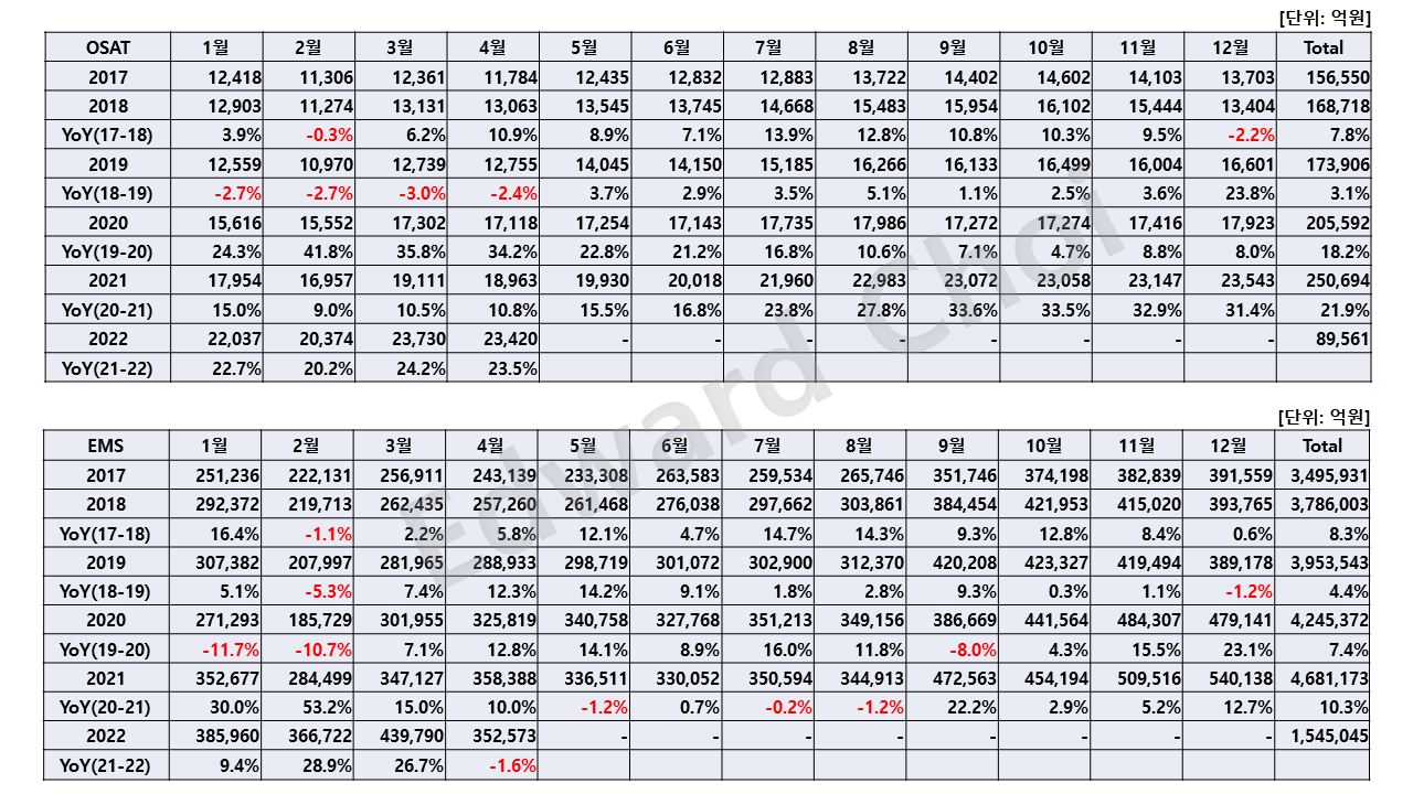 Foundry와 Memory의 전방산업에 해당하는 OSAT와 EMS의 매출액 변화를 짚어보자. 매출액 변화에서 볼 수 있듯이 Foundry에서 생산되는 Wafer가 증가하고 선단 패키징에 대한 수요가 늘면서 패키징과 테스트에 대한 위탁 생산 수량은 꺾이지 않고 있다. 이런 시장 수요에 힘입어 OSAT업체들 역시 2021년 대비 20%가 넘게 매출액이 증가했다. 2020년까지 월 매출액 2조 원을 넘지 못했던 OSAT업체들은 2021년 6월 월 매출액 2조 원을 넘어서더니 2022년까지 이를 유지하고 있다. 전방산업 둔화로 인해 저가 반도체 패키징을 위주로 사업을 영위하는 중소형 업체들의 경우, 이미 3월부터 매출액이 감소하고 있지만 고부가가치 반도체 비중이 높은 업체들은 매출액에 큰 변화가 없다.