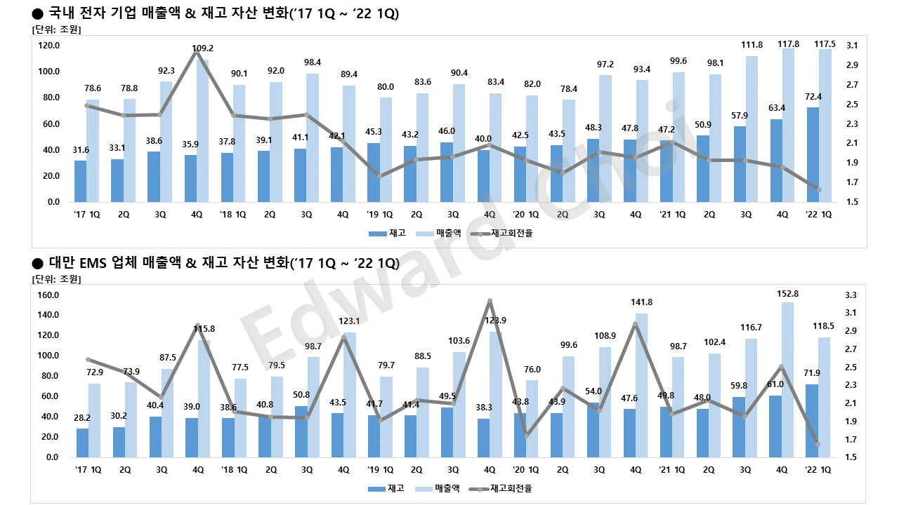2022년 1분기가 마감 실적을 보면 한국을 대표하는 전자 기업들과 대만 EMS 기업들의 매출액과 재고 자산 내역이 놀라울 만큼 닮아 있다. 급증하는 재고 자산이 소진되지 못하면 원자재, 설비 업체들의 수주 절벽으로 이어지는 것은 자명한 사실이다. 이는 산업 전반을 뒤흔들 기폭제가 될 수 있다. 국내 전자 기업과 EMS업체들 그리고 반도체 공급망 전체에서 동일하게 벌어지고 있는 재고 과다 이슈에 대해 주목하고 있는 이유이다.