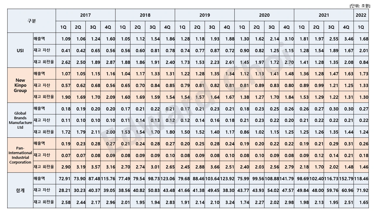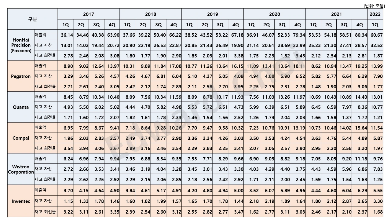 -. 대만 EMS 업체(10개사) : 매출액 118.46조 원, 재고 자산 71.92조 원, 재고 회전율 1.65
