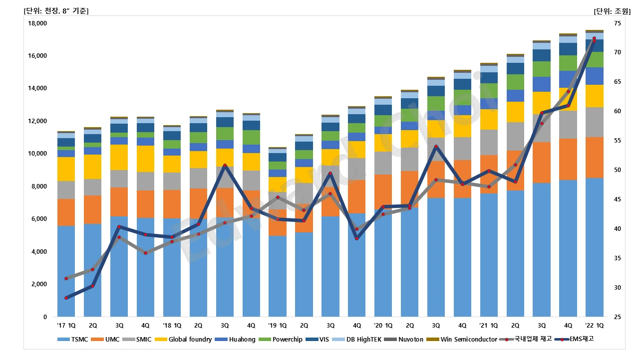 가장 최근 반도체 산업이 다운 사이클에 진입했던 2019년 1Q 이후, Foundry 업체들의 Wafer 출하량은 꾸준히 증가해 왔다. 해당 자료에는 삼성전자와 Tower Jazz의 Foundry Wafer 가공 수량이 포함되어 있지 않지만 대세를 읽는 데에는 부족함이 없을 것으로 생각된다. 메모리 반도체 업체들의 Wafer 가공 수량에 대한 공시자료가 없다. 그래서 국내외 메모리 반도체 업체들에게 패키징 소재를 공급하는 업체들의 동향을 통해 메모리 반도체 업체들의 시황을 추정했다. 소재 업체들의 실적이 지속적으로 우상향 하는 것으로 보았을 때 메모리 반도체의 Wafer 생산량 역시 Foundry와 유사한 패턴을 보이고 있다. 위에 있는 그래프에서 주목할 것은 거침없이 상승하는 Wafer 출하량과 쌓여가는 최종 고객사(전자 기업 & EMS)들의 재고 자산이다.
