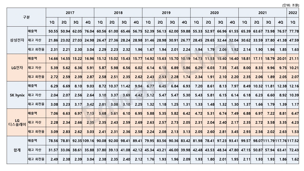 -. 국내 전자 기업(4개사) : 매출액 117.52조 원, 재고 자산 72.43조 원, 재고 회전율 1.62