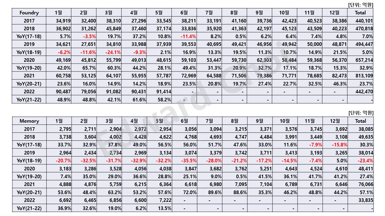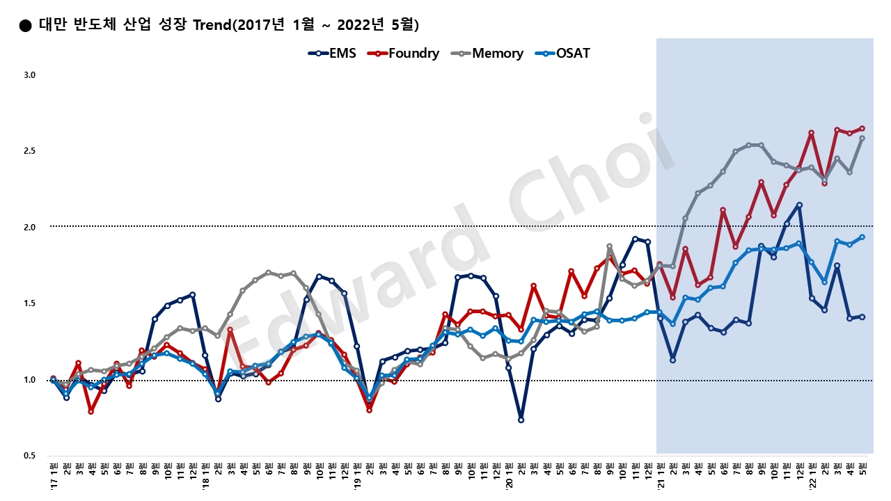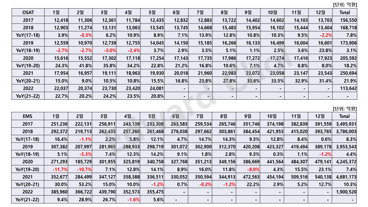 5월 대만 반도체 산업 실적을 정리해 보면 전자 제품을 생산하는 EMS의 부진이 이어지는 가운데 몇몇 업체를 제외하면 후방 산업(Foundry & OSAT)은 아직 건재한 모습이다. Foundry 업체들의 성장세가 지속되며 OSAT업계의 매출액은 사상 최고치를 경신하는 기염을 토하고 있다. 그러나 전후방 산업 간의 괴리가 커지고 있기 때문에 어느 시점에서는 과도하게 생산된 반도체가 현재의 공급망에 속한 업체들을 강하게 압박할 시기가 올 수밖에 없다. 사상 최고치를 경신하고 있는 재고 자산에 대해 본격적인 재고 조정이 들어가는 그때가 바로 반도체 산업 혹한기의 시작이다. 다만 현재 시장 참여자들은 그 시기를 두려워하되 앞당기고 싶어 하지 않는다. 초여름의 무더운 날씨와 다르게 반도체 산업의 향후 시황은 서늘하기만 하다.