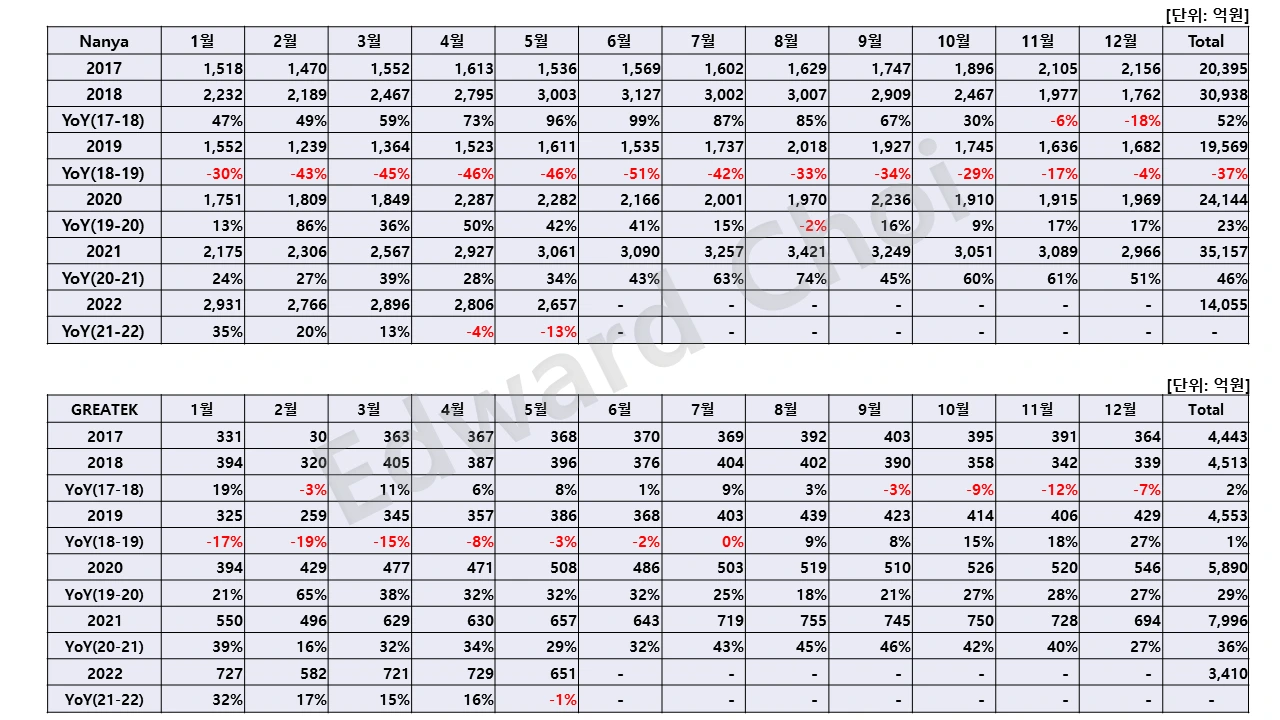 그리고 개인적으로 반도체 경기를 가늠하는 척도인 GREATEK의 매출액이 2019년 8월 이후 처음으로 YoY 마이너스로 돌아섰다. Lead Frame Base의 저가 반도체를 대량 생산하는 GREATEK의 특성상, EMS업체들의 재고 조정에 민감하게 반응한다. 저가 반도체의 경우, 납기가 빠르고 EMS가 보유한 재고량이 많기 때문에 반도체 다운사이클의 초입에서 가장 먼저 영향을 보인다. 그렇기 때문에 작은 폭의 방향 전환이지만 GREATEK의 5월 매출액 YoY 변화에 대해 관심을 가지고 지켜보고 있다.