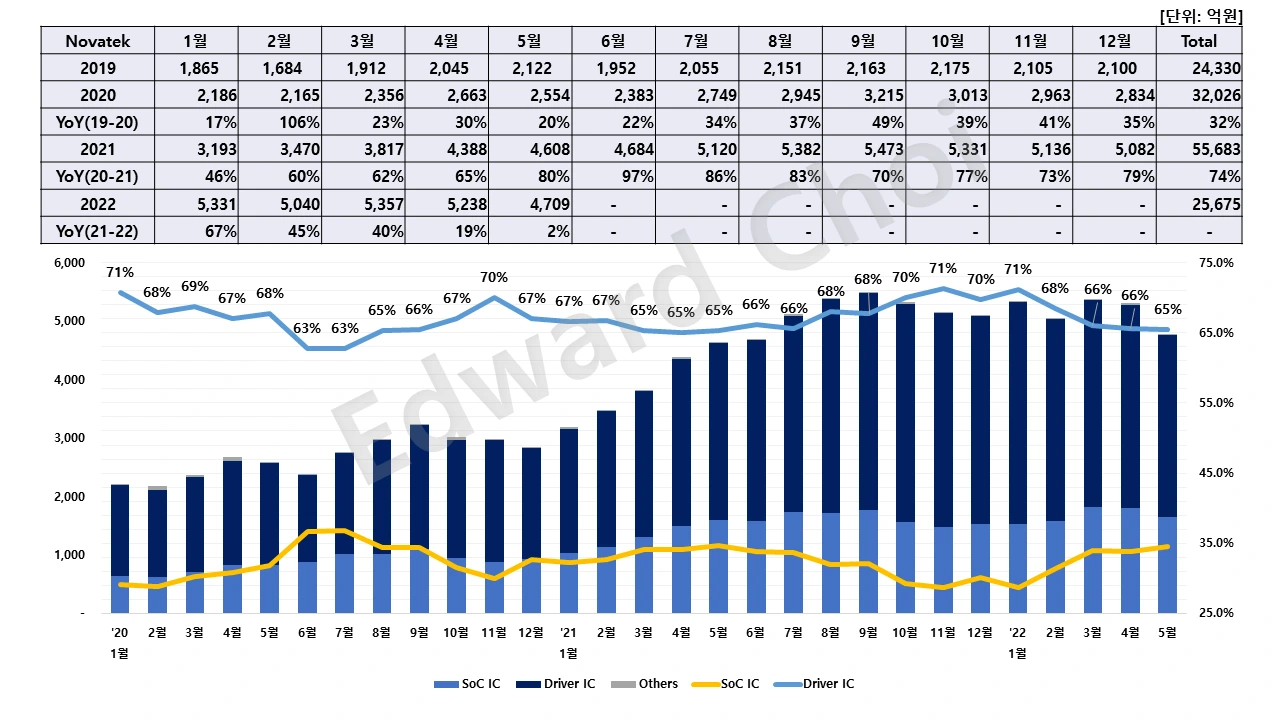서두에서 언급한 바와 같이, 몇몇 업체에서 반도체 다운 사이클에 대한 움직임이 있어 해당 업체의 현황을 자세히 살펴보고자 한다. 먼저 대만의 대표적인 DDI(Display Driver IC) 칩 설계 업체인 Novatek의 매출액 변화를 주목해야 한다. Novatek은 Mediatek에 이은 대만 2위 Fabless 업체로서 2021년 매출액 5.56조 원으로 글로벌 Top Tier Fabless업체 중 하나이다. Novatek는 스마트 폰, 태블릿, TV용 패널에 사용되는 DDI 칩을 대만, 중국 패널 메이커들에게 공급하고 있다. 팬더믹 이후, 비대면 경제 성장으로 인해 전자 기기 수요량 급증에 따라 매출액이 지속적으로 우상향해 왔다.