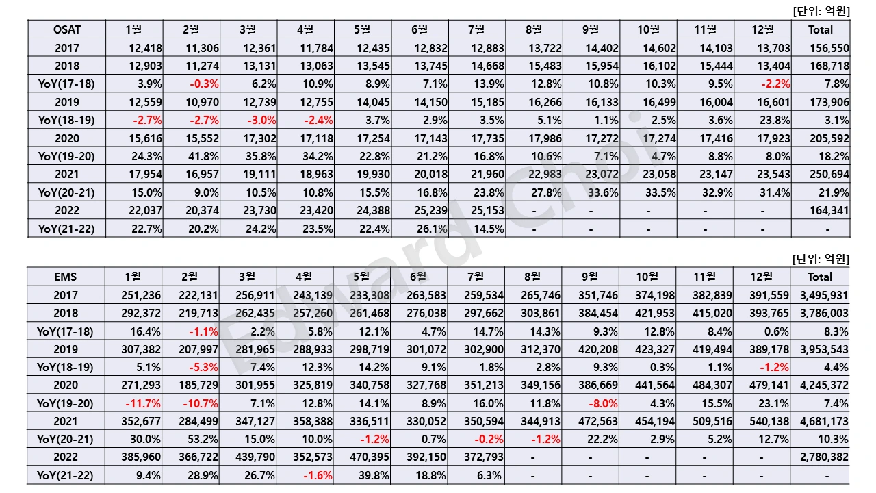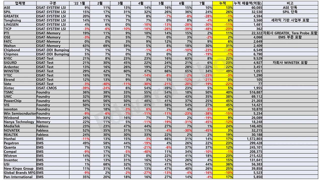 7월 마감 기준 대만의 20개에 달하는 OSAT상장사들 중, 이미 10개 업체의 연간 매출액이 감소세로 돌아섰다. 특히 Lead Frame 기반의 저가, 저사양 반도체를 위탁 생산하는 업체들(GREATEK, TICP, Lingsen, YTEC)의 매출 감소가 컸으며 감소세는 시간이 갈수록 커지고 있다. 저사양 반도체의 주요 Foundry 업체인 Win Semiconductor와 novoton 그리고 대만의 수많은 중소형 팹리스 업체들의 매출 감소가 이들 업체들과 연계되어 있다.
