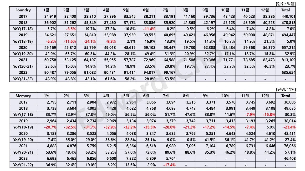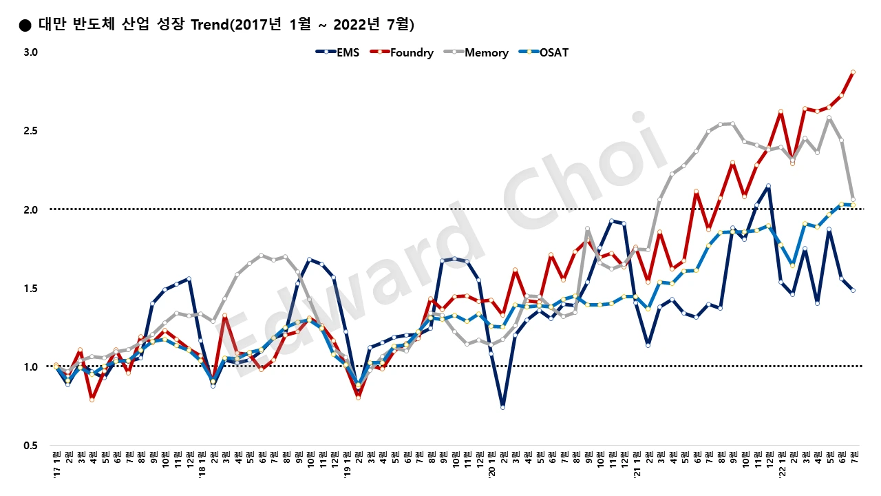 TSMC, UMC를 비롯한 대만의 중대형 Foundry 업체들은 2022년 7월까지의 누적 매출액에서 작년 대비 38%~45%에 달하는 매출 성장을 달성했다. TSMC의 경우, 2022년 전 세계 반도체 기업 중 영업이익 1위에 오를 것이 확실시되고 있다. 이처럼 대만의 Foundry 산업은 성장 일로에 있지만 전후방의 산업이 흔들리고 있다. 꺾이지 않는 Foundry의 성장세로 인해 향후 반도체 산업이 경착륙 할 것에 대한 우려가 커지고 있다.
