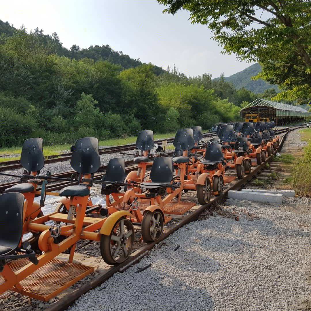 레일바이크가 주욱 서 있는 곳에서 한참 어슬렁거리다보니 레일바이크들이 서로 연결되어있다. 내가 저것들도 다 끌고 타야하나? 싶었지만 친절하게도 직원분이 내가 탈 2인승 레일바이크만 똑 떼주셨다. 출발하기 전 이런저런 탑승할 때 주의사항을 듣고있는데 그 직원분 하시는 말.