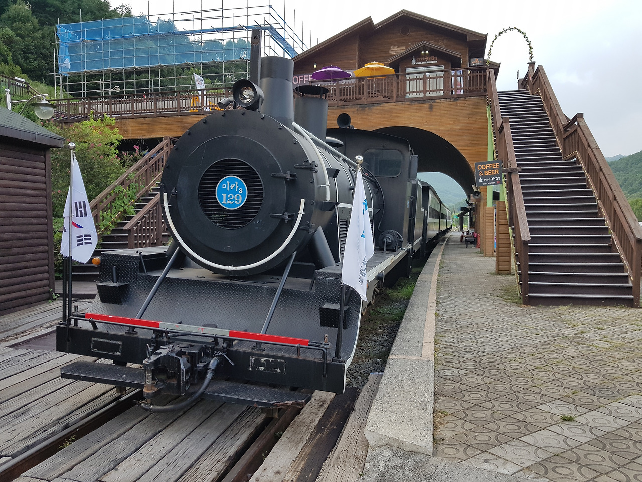 레모네이드 한 방울까지 남김없이 털어 마시고서는 약 20분간의 지옥의 레이싱도 되새김질 할 겸 여유롭게 승강장 주변을 어슬렁거렸다. 기차마을로 다시 돌아가는 증기기관차가 10분이면 도착한다고 직원 분이 넌지시 말해주셨다. 예, 그 젠장맞을 증기기관차 때문에 그 고생한 거 아니겠어요, 선생님. 속으로 투덜투덜하며 매표소에서 4000원에 기차마을로 가는 증기기관차 티켓을 끊었다. 얼마 지나지 않아 저 멀리서 철도박물관에서나 볼 법한 옛날 기차가 느릿느릿 들어왔다. 정말이지 어금니가 부득부득 갈려나갔지만, 정말 오랜만에 예전 비둘기호의 그 감성을 조금이나마 추억하며 앉을 수 있는 고전적이고 옛날 냄새나는 기차의 비주얼에 잠시 분노를 접어두었다.