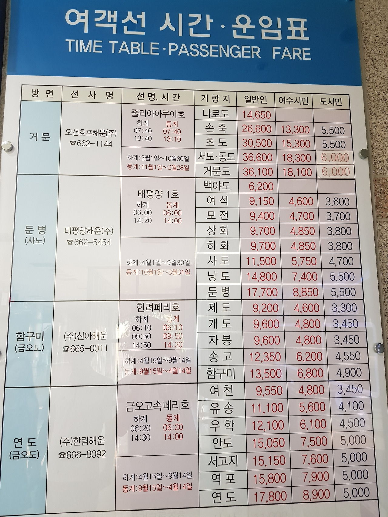 저 배들은 어디서 온 거지? 막연하게 배들을 따라 걷다 보니 진짜 '배 타는 곳'이 나왔다. 벽화마을 위에서도 훤히 보이는 여수여객터미널이다. 잠깐 에어컨 바람도 쐴 겸, 내일 혹시라도 갈 만한 곳이 있을까 싶어 행선지가 적혀 있는 요금표를 보러 안으로 들어갔다. 거문도를 제외하면 정말 작은 섬 밖에 들어가지 않는다. 거문도조차도 하루에 두 번 출항하는 것을 보아하니 여수에서 섬을 들어가는 관광객의 수요 자체가 적은가 보다. 게다가 어떤 섬을 들어가도 왕복 배 삯이 꽤나 비싼 데다가 한 번 들어가면 그곳에서 무조건 1박을 해야 하는 절망적인 시간표인지라, 일찌감치 섬에 들어가는 것은 포기했다.