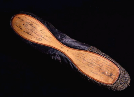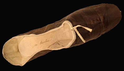 역사상 ‘첫 포인트 슈즈’로 인정받는 마리 탈리오니의 포인트슈즈입니다. 다소 생소한 형태의 이 슈즈는 지금의 포인트슈즈와는 구조와 강도 면에서 꽤 차이가 있습니다. 우리가 신는 포인트슈즈는 모두 발끝이 단단하고 평평합니다. 발을 균형감 있게 잡아주고 지탱할 수 있도록 도와주는 ‘토박스(toe box)’가 있기 때문이죠. 덕분에 우리는 토박스에 체중을 실어 발을 끝까지 세울 수 있게 되었고, 그 위에서 온갖 화려한 동작을 구사할 수 있습니다. 그런데 탈리오니의 포인트슈즈는 토박스가 없고 발끝이 뾰족합니다. 발을 받쳐주는 일종의 틀없이 어떻게 발을 세웠나 싶지만, 가죽 재질로 슈즈 옆과 끝부분을 두껍께 꿰매고 발가락을 고르게 모아주는 정도의 구조였습니다. 결국 발을 보호할 수 있는 형태의 구조가 전혀 아니었던 것이지요.