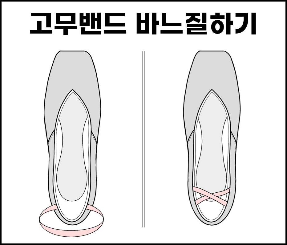 - 슈즈가 벗겨지지 않도록 고무밴드도 달아볼까요? 포인트슈즈를 신고 정자세로 서서 발목 전면을 고무밴드로 감싸봅니다. 그다음 살짝 타이트하다고 느껴질 만큼 밴드 길이를 조절해 밴드 끝부분이 뒤꿈치 양측면과 맞닿는 위치에서 바느질합니다. 가능하면 깔끔한 슈즈 외관을 위해 슈즈 내부에 꿰매는 것이 좋겠죠. 일반적으로는 고무밴드를 한 줄로 달지만 때로는 취향에 따라 X자로 겹친 이중 고무밴드를 활용해서 발을 슈즈에 더욱 밀착시키고 아치를 강조하기도 합니다.