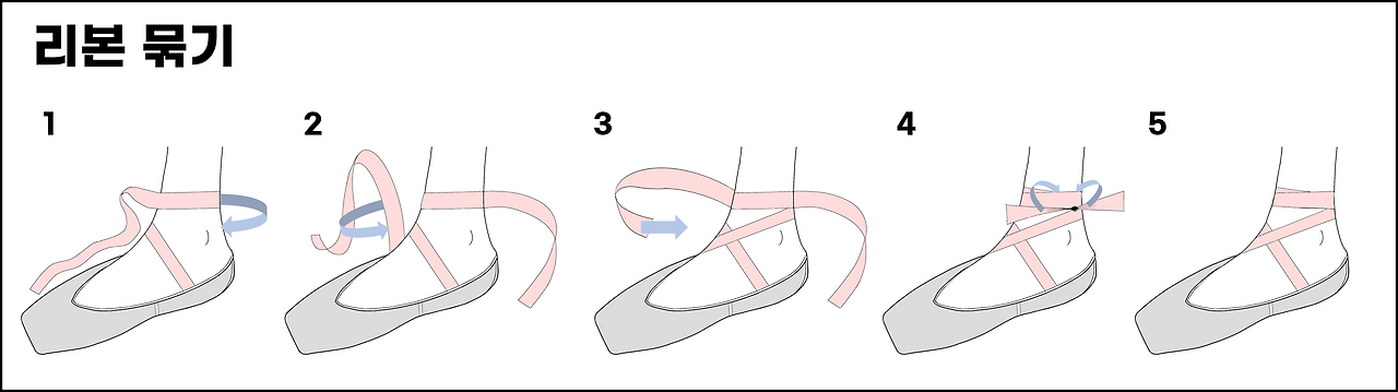 낯선 신발 끈(?)을 어디서부터 묶어야 하나 싶지만 막상 한번 손에 익으면 리본 묶기는 생각보다 쉽습니다. 우선 플렉스(flex)의 발에서 한쪽 리본을 들어 발등 위를 지나 발목에 한 바퀴 두르고 반대쪽 리본도 똑같이 둘러 발등에 X자를 만들어 줍니다. 발목을 두른 두 리본을 안쪽 복사뼈 근처에서 모아 묶습니다. 그리고 매듭과 리본의 끝부분이 보이지 않도록 안쪽으로 넣어 깔끔하게 정리하면 끝이죠. 리본이 발목을 가볍게 조여서 발을 지지해주는 느낌을 기억합니다.