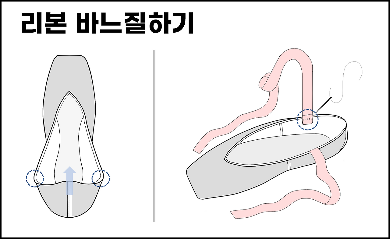 - 포인트슈즈 뒷부분을 앞으로 쭉 당겨 접었을 때, 접힌 부분을 펜이나 연필로 가볍게 표시합니다. 그리고 올이 쉽게 풀리지 않도록 양쪽 끝을 불에 살짝 지진 리본을 미리 표시한 위치에 꿰매줍니다. 이때 슈즈 바인딩을 피해서 바느질하는 것이 중요합니다. 바인딩 안에 있는 조임끈은 자유로워야 하기 때문이죠. 또한 리본이 쉽게 해질 수 있어 리본의 한쪽 끝을 15~20mm 정도 덧대어 접고, 슈즈 안쪽에 재봉하는 것이 좋습니다.