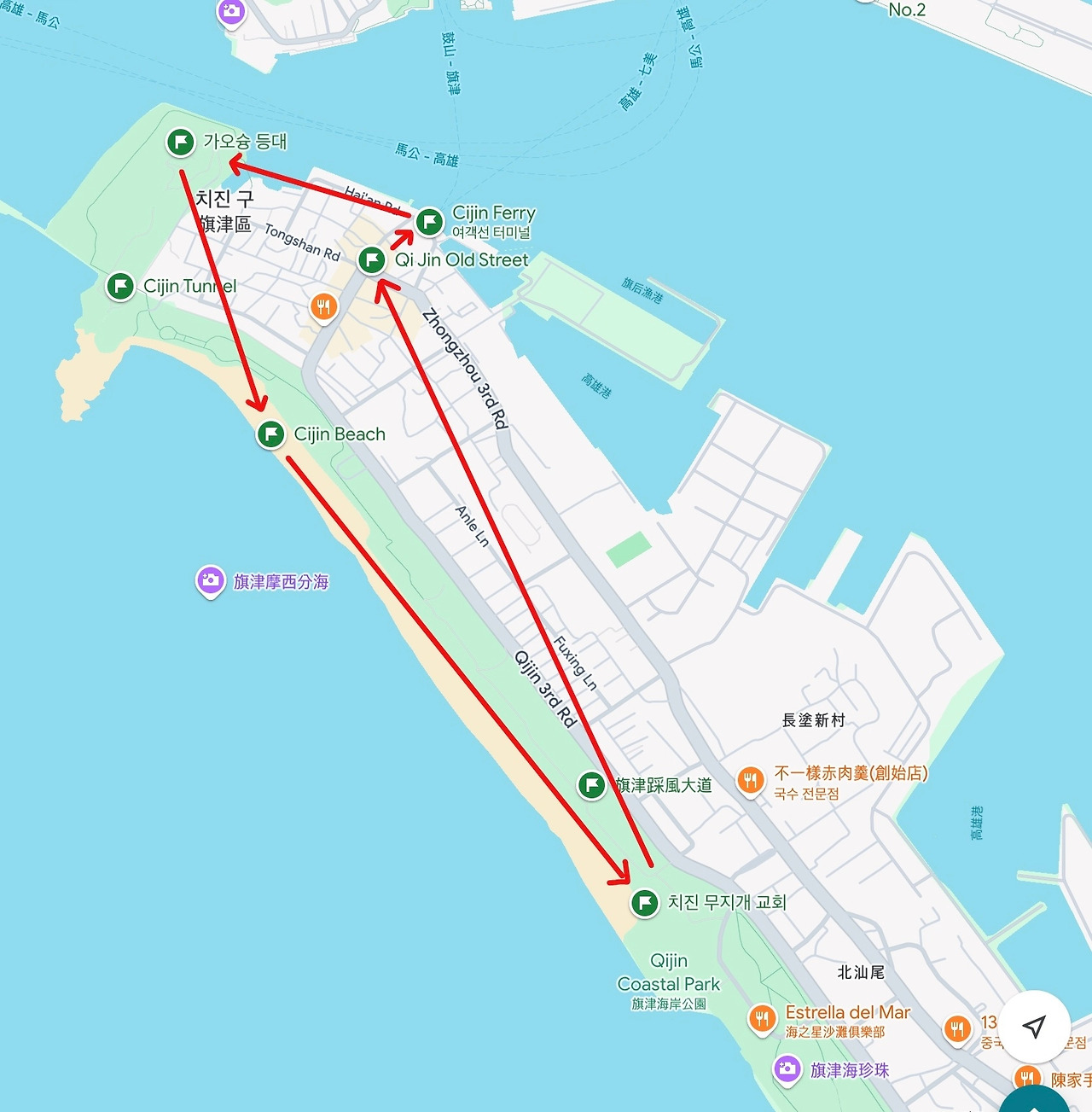 나의 치진섬 여행 계획은 섬 북서쪽에 있는 가오슝 등대를 보고 해수욕장을 쭉 걸어서 동남쪽에 있는 무지개 교회를 찍고 돌아오는 것이었다.