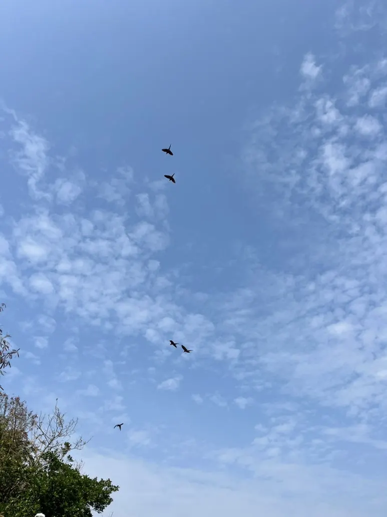 고개를 들고, 눈을 가늘게 뜬 채 커다란 새를 유심히 바라보았다. 그리고 나는 내 두 눈을 의심했다. 커다란 앵무새들이 짝을 이뤄 하늘을 날고 있는 것이었다.