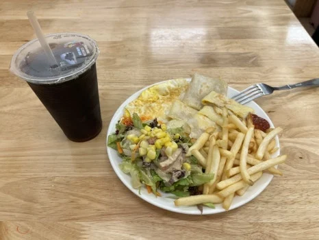 그렇기 때문에 오늘만큼은 평소의 편의점 삼각김밥, 과일, 빵 등이 아닌, 제대로 된 '타이완식 플래터'를 먹기로 했다. 타이완식이라고 하길래 어떤 음식 인가 하고 조금 기대했는데, 딴삥과 계란프라이, 감자튀김, 참치샐러드가 한 접시 가득 나왔다. 여기에 시원하고 달콤한 홍차 한 잔이면 게임 끝!