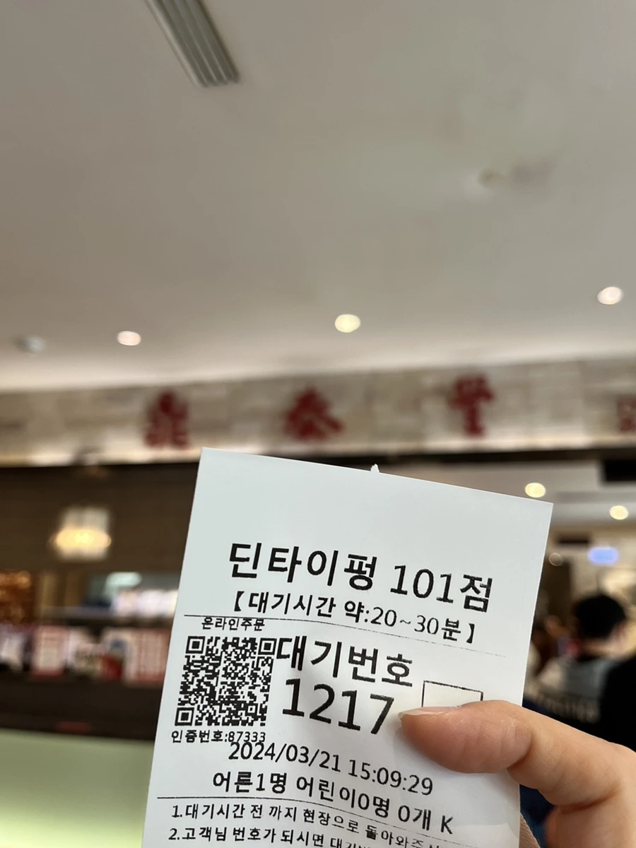 카운터에 가서 인원수를 말하면 순서대기표를 나눠주는데, 대기표에 있는 큐알코드를 통해 딘타이펑 사이트에 접속하면 그곳에서 음식을 주문할 수도 있고, 얼마나 더 기다려야 하는지 알 수 있어서 굉장히 편리했다.