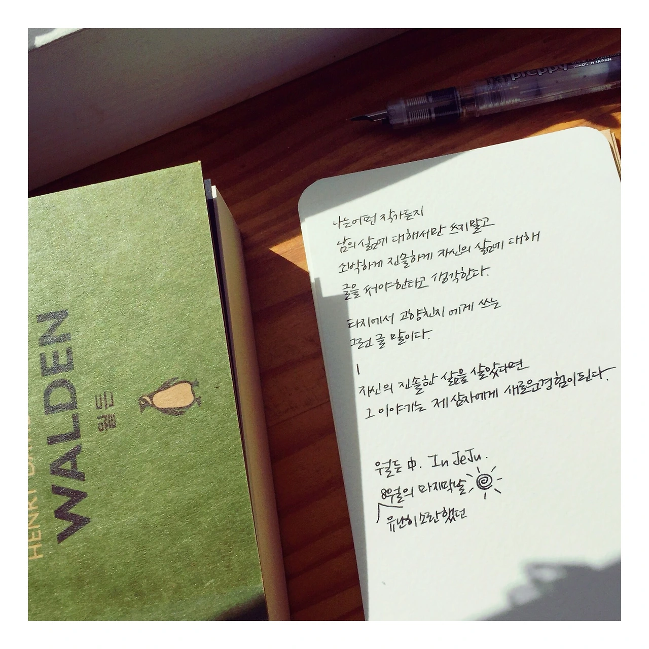 아침 아.아를 게스트하우스 카페에서 들이키고 책 한 권을 집어 들었다. 내가 참 애정 하는 펭귄북스 출판사의(표지 디자인이 참 마음에 든다.) '월든'이었다. 소박하고도 철학적이며 저항적이기까지 한 이 책은 제주도의 나와 찰떡이었다. 월든을 읽으며 폭풍 같았던 지난 5개월을 돌아보았다.