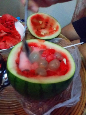 내가 사랑하는 용과, 롱안(리치?), 망고스틴, 수박 그리고 사이다를 사서 숙소로 돌아왔다. 보기에는 조금 거시기 하지만, 한 번 맛보면 잊을 수 없는 열대과일 화채였다. 수박 한통을 비우고 나서야, 음료수 하나씩 들고 노을 진 테라스로 나갔다.