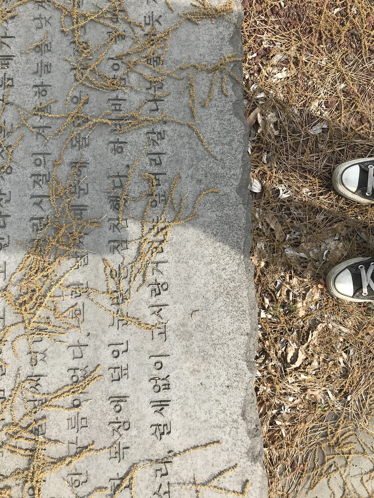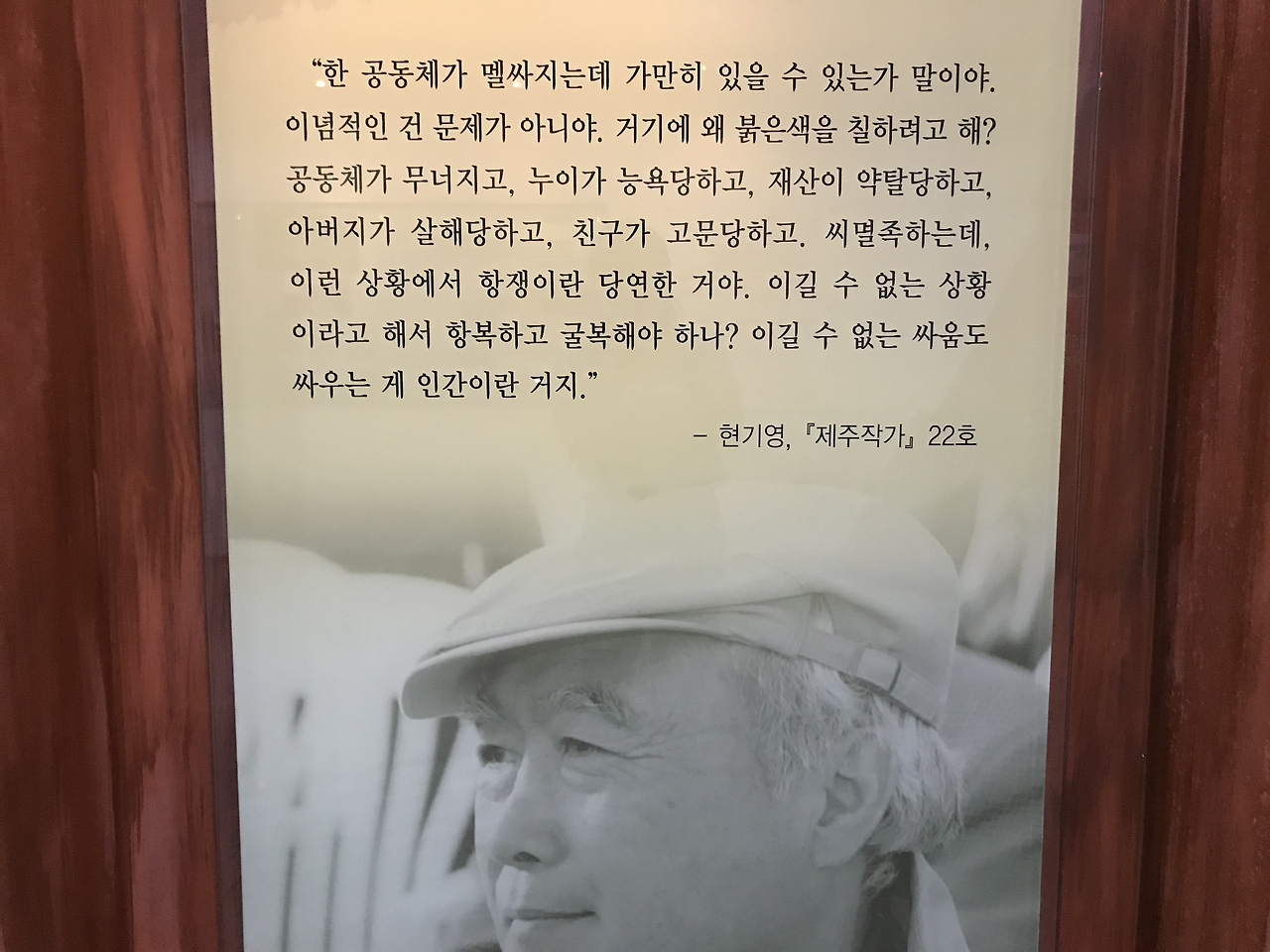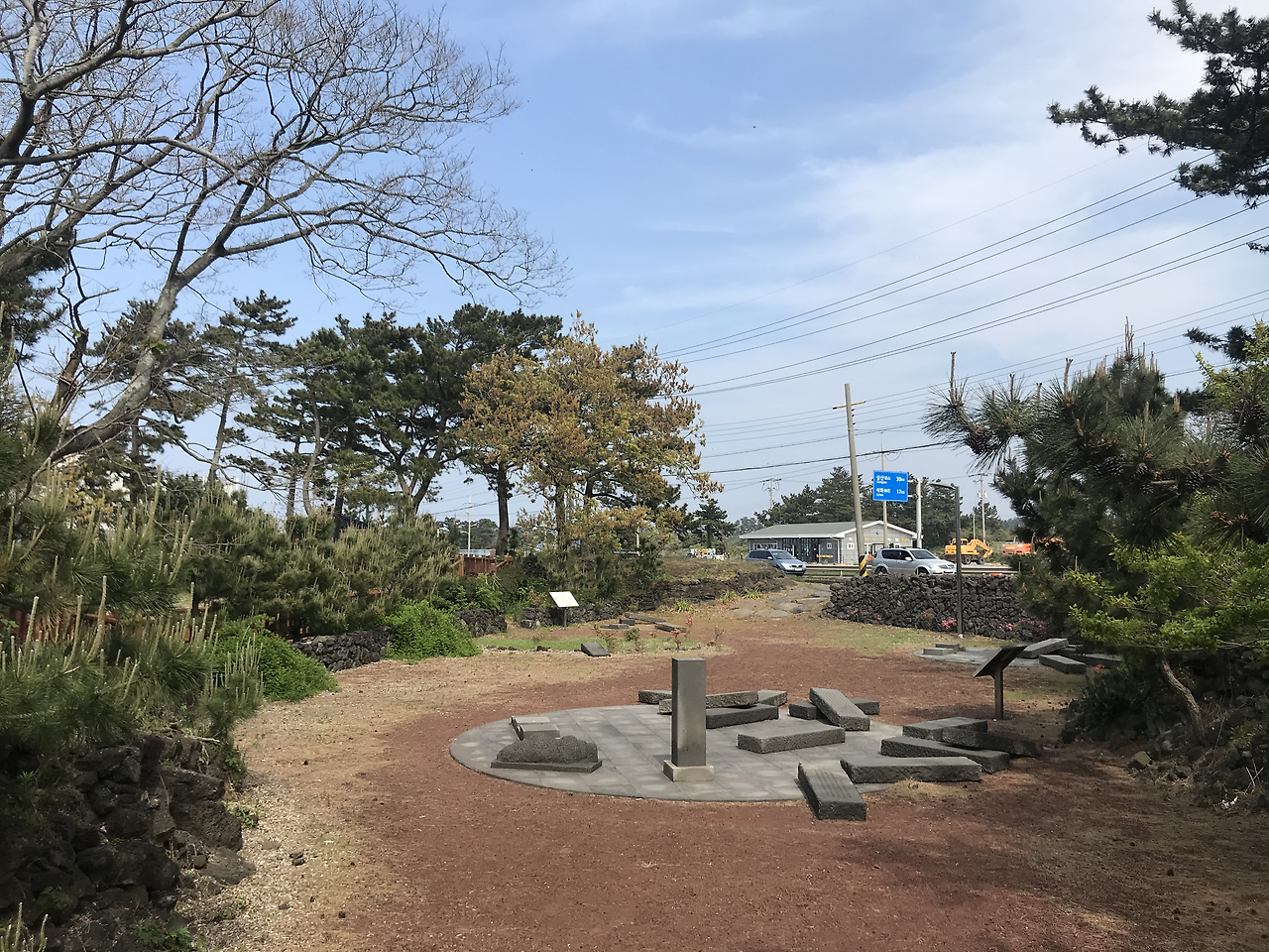 (사람들이 무 뽑힌 것처럼 죽어 널브러져 있다고 해서 이름 붙여진 ‘옴팡밭’. 현기영 소설가의 ‘순이삼촌’의 글귀가 비석이 되어 여기저기 누워있다.)