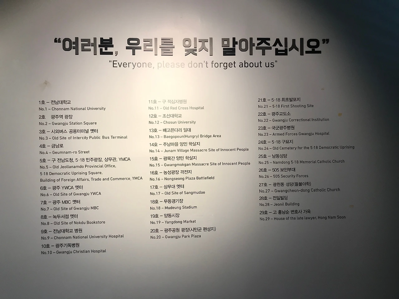 엄마가 너에게 이야기해주고 싶은 사람은 정말 많아. 당시 정말 많은 사람들이 헌혈을 했는데(부상자가 많아서) 그중 박금희라는 한 고등학생이 헌혈을 하고 돌아가는 바로 그 길에 총을 맞았데. 그래서 조금 전 자신이 피를 빼주었던 병원으로 실려 왔는데, 당시 간호사의 증언은 그 헌혈을 하지 않았다면 출혈이 덜해 살았을 거라 하더라고. 한강의 소설 <소년이 온다>에 '동호'로 나오는 인물인 문재학 학생의 이야기도 있지. 친구를 찾으러 왔다가 상무관에서 시민들의 시체 닦고 번호를 붙이는 일을 하다가 '내일 돌아가겠다'는 어머니와의 약속을 지키지 못하게 된 어느 소년의 이야기.