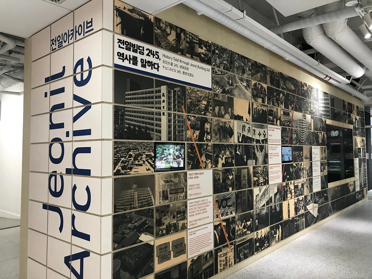 전일빌딩 1층은 역사 속에서 살아간 전일빌딩의 자기소개로 시작된다. 2~3층에 올라가 보니 디지털 정보 도서관이라는 시민 공간이 있었다. 5~7층은 광주콘텐츠 허브로 각종 창작 기업들이 들어가 있다. 5.18 민주화운동의 총탄 흔적과 관련 내용은 9~10층에서 확인할 수 있다.