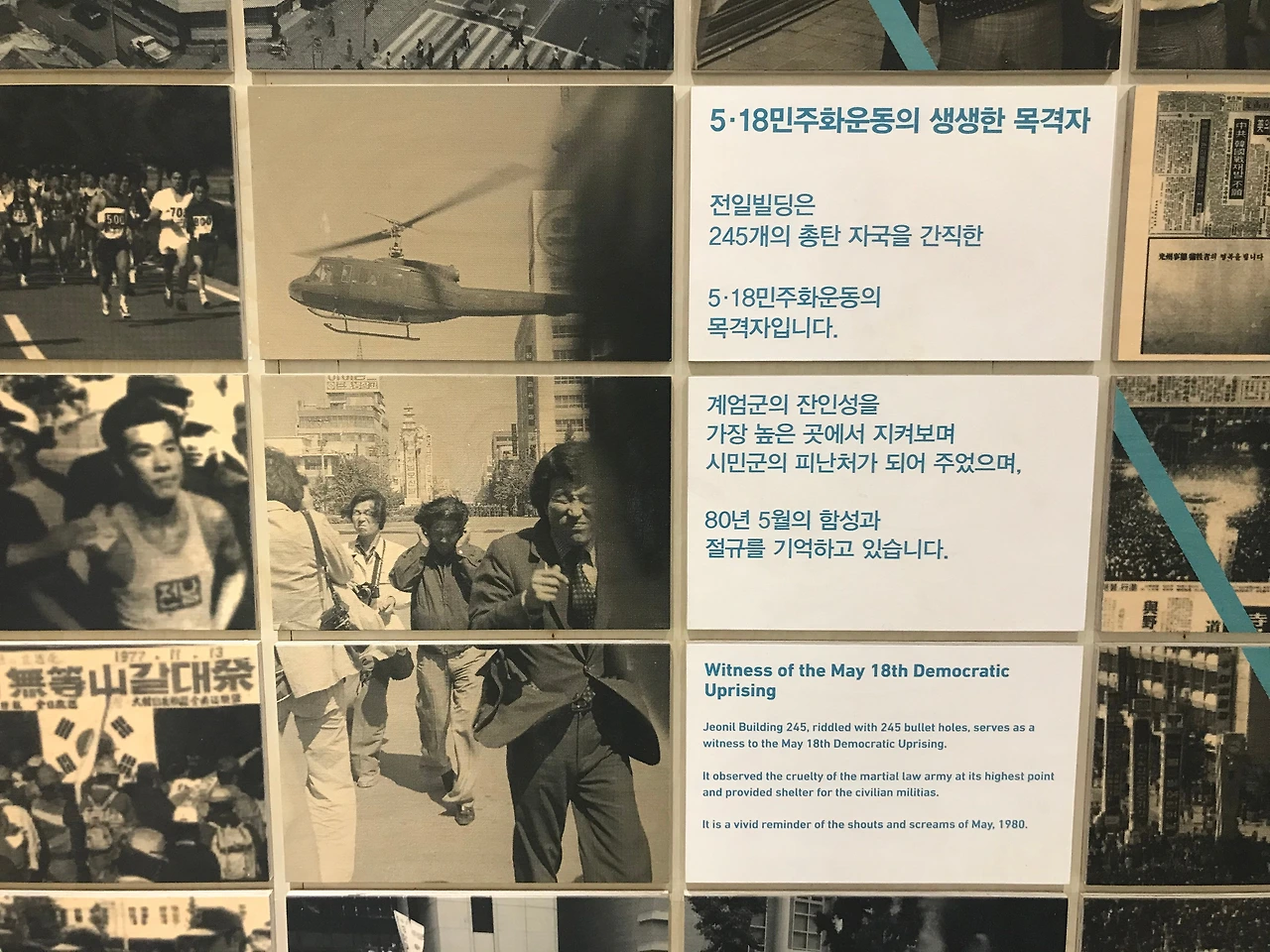 안전상의 이유 등으로 철거가 논의되던 전일빌딩에서 5.18 민주화 운동 당시 헬기 사격을 받은 흔적들이 발견되면서 광주의 역사를 지닌 이 건물을 지켜야 한다는 목소리가 높아졌고, 전일빌딩은 효율성과 자본의 논리를 거스르고 지켜질 수 있었다.